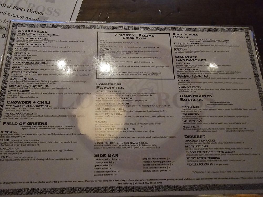 “ Needed a place to meet our Medford-living daughter and our Charlestown-based son for Saturday lunch. LongCross won the assignment and it is likely to be atop the future lunch list for the Medford area. Great, easy parking. A new building and restaurant with lots of windows. Service was very good, seated right away and orders taken for drinks and food at a leisurely but not "they forgot about us" pace. It is Oktoberfest so I tried an Oktoberfest beer, of which there were several, and brats. Delicious. Our daughter got a burger and I admit I ate 1/4 of it and brought the rest home with me. Best burger I have had in a while. Perfectly cooked and good flavor. Nice decor, comfy. High tops, regular seating and bar seating all available. Saw a family with about 5 small kids having an early lunch. All kids had "kid cups with lids" so seems like a kid-friendly place. ”